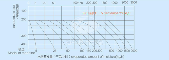 注:水份蒸發量與物料的特性及熱進風、出口溫度相關。當出口溫度為90oC,其水份蒸發曲線見上圖(供選型參考),隨著產品不斷更新,有關參數變更,恕不預先通知。