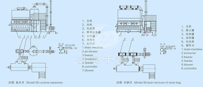 XF系列臥式沸騰干燥機又稱流化床或者沸騰床,它是由空氣過濾器、沸騰床主機、旋風分離器、布袋除塵器、高壓離心通風機、操作臺組成。由于干燥物料的性質不同,配套除塵設備時,可按需要考慮,可同時選擇旋風分離器、布袋除塵器,也可選擇其中一種。一般來說,比重較大的沖劑及顆粒物料干燥只需選擇旋風分離器。比重較輕的小顆粒狀和粉狀物料需配套布袋除塵器,并備有氣力送料裝置及皮帶輸機供選擇。蒸氣、電、熱風爐均可配用(按用戶要求配套)。