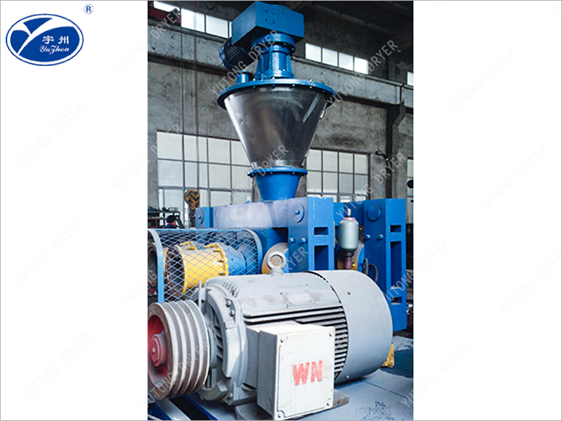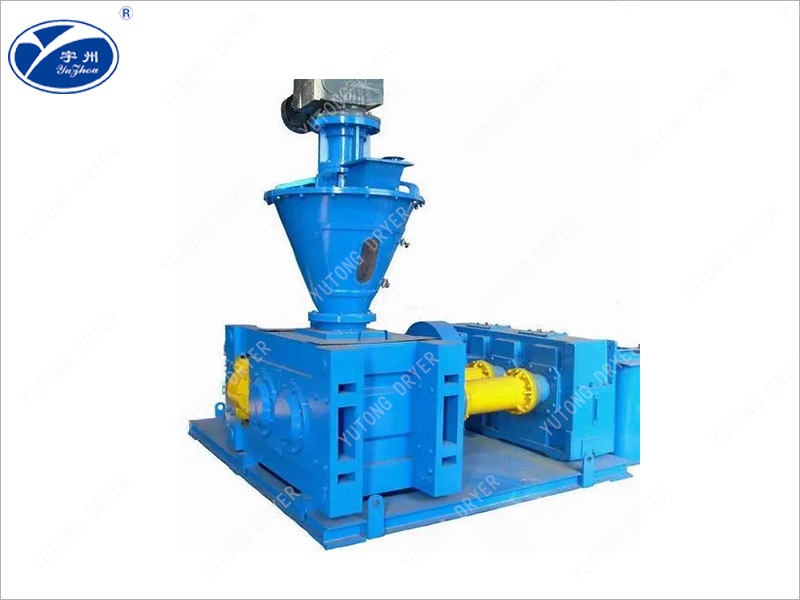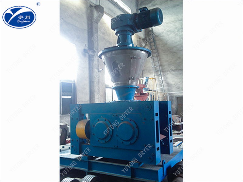 各種干粉物料從設備頂部加入,經脫氣、螺旋預壓進入兩個平等軋輥,軋輥相對旋轉,物料被強制送入兩輥之間,帶槽軋輥將物料咬入輥隙被強制壓縮,物料通過壓縮區后,物料的表面張力和重力使之自然脫出。脫出后的指條狀團塊進入碎粒機由旋轉刀排破碎,被破碎的物料進入整粒機通過滾動刀排使顆粒和部分粉狀物料進入旋振篩進行篩分。合格品通過輸送機被送入成品倉。粉狀篩下物料通過輸送機再次被送回原料倉進行二次輥壓,擠壓力的大小可根據造粒操作的需要由液壓油缸的壓力進行調節。 通過改變輥面開槽形式,可得到片狀、條狀、扁球狀物料。