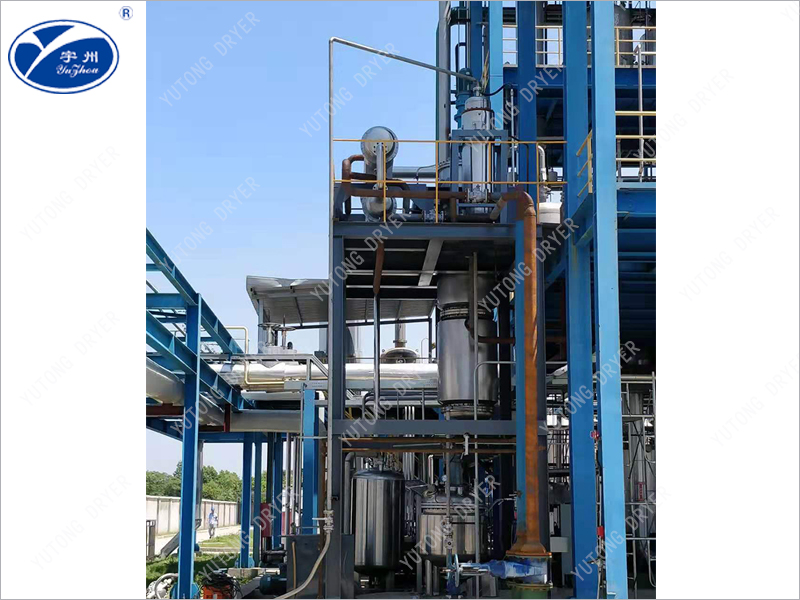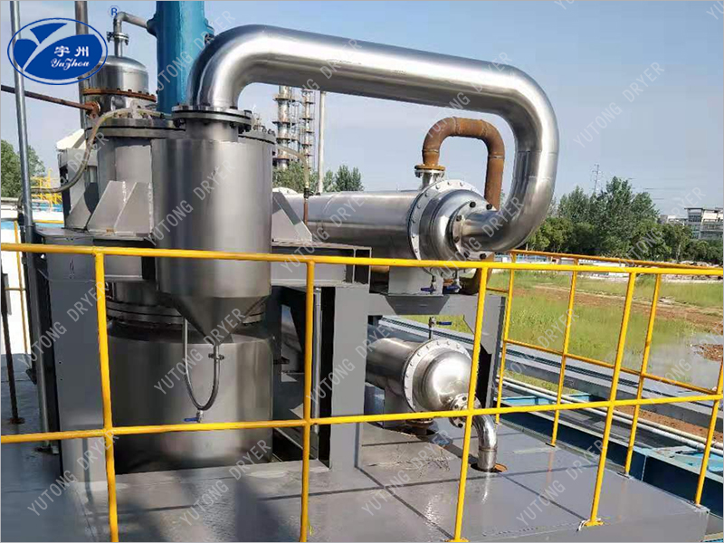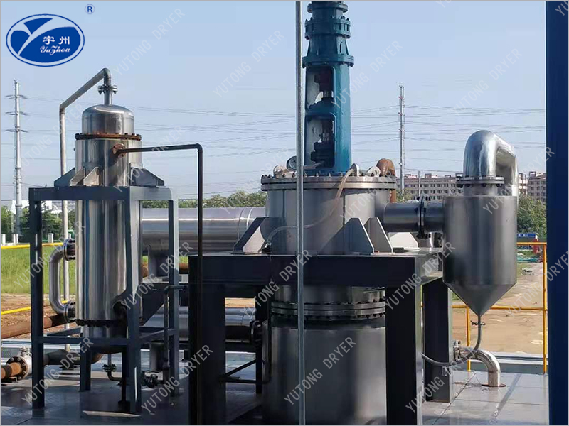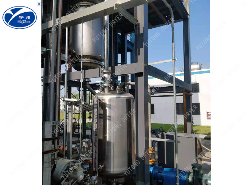 Материал радиально поступает в испаритель из верхней части зоны нагрева и распределяется через распределитель к нагревательной стенке испарителя. Затем вращающийся скребок непрерывно и равномерно царапает материал в тонкую и однородную жидкую пленку на нагреваемой поверхности и толкает его вниз в спиральную форму. Во время этого процесса вращающийся скребок обеспечивает непрерывное равновесие жидкой пленки, создавая высокоскоростную турбулентность, предотвращая коксование жидкой пленки на нагреваемой поверхности, тем самым увеличивая общий коэффициент передачи. Легкие компоненты испаряются, образуя поток пара, который поднимается и достигает внешнего конденсатора, непосредственно подключенного к испарителю через газожидкостный сепаратор. Тяжелые компоненты выводятся из конуса на дне испарителя. Уникальный распределитель не только равномерно течет материал во внутреннюю стенку испарителя, предотвращает попадание материала в испаритель и впрыскивает пар, но и предотвращает испарение вновь поступающего материала здесь, что способствует устранению пены. Материал может испаряться только вдоль нагреваемой поверхности. Центробежные сепараторы, разработанные на основе свойств материала, установлены в верхней части скребкового испарителя для разделения капель в восходящем потоке пара и возвращения их в распределитель.